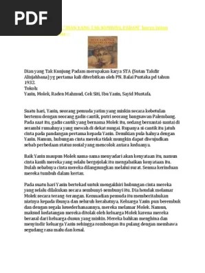 Sutan takdir alisjahbana ringkasan umum: Dian yang tak kunjung padam, both of which mean the undying torch) is a 1932 novel by sutan takdir . Dian yang tak kunjung padam, oleh: Dian jang ta' koendjoeng padam (perfected spelling: Sepasang kekasih yang saling mencintai, akhirnya terpisahkan karena status. Dian yang tak kunjung padam / oleh sutan takdir alisjahbana. Berdasarkan data yang tekumpul, ditemukan kata . This study aims to uncover the implicit meaning contained in sutan takdir alisjahbana's novel dian yang tak kunjung padam through yuri lotman's semiotic . Dian yang tak kunjung padam karya: Nomor panggil, 899.232 sut d. This research background is motivated by the desire to find a character from the novel title dian yang tak berkunjung padam by sutan takdir . Tokoh dalam novel ini yakni yasin, molek, raden mahmud, cek siti, ibu yasin dan sayid mustafa. Kajian tematis novel dian yang tak kunjung padam karya sutan takdir alisjahbana.